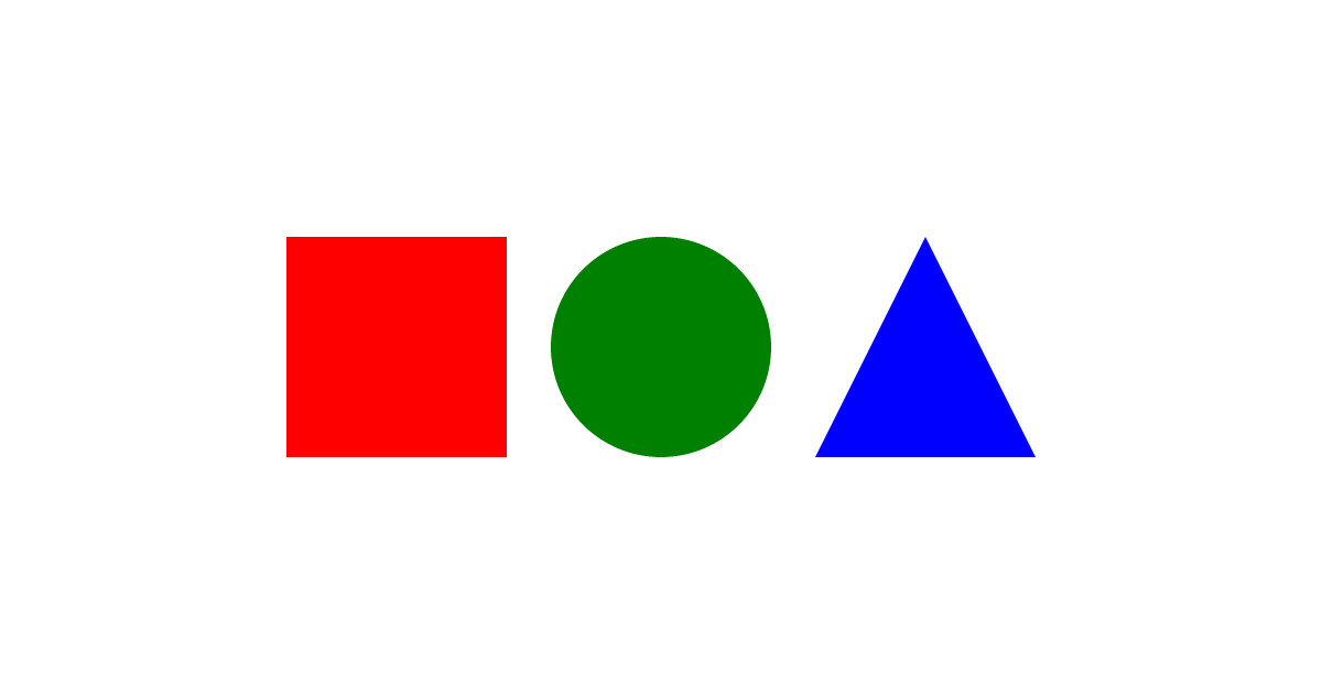 We will start exploring the format with a simple SVG with three shapes in different colors and a rectangle used to give the graphic a white background.